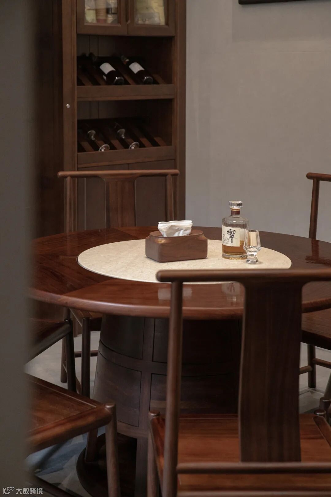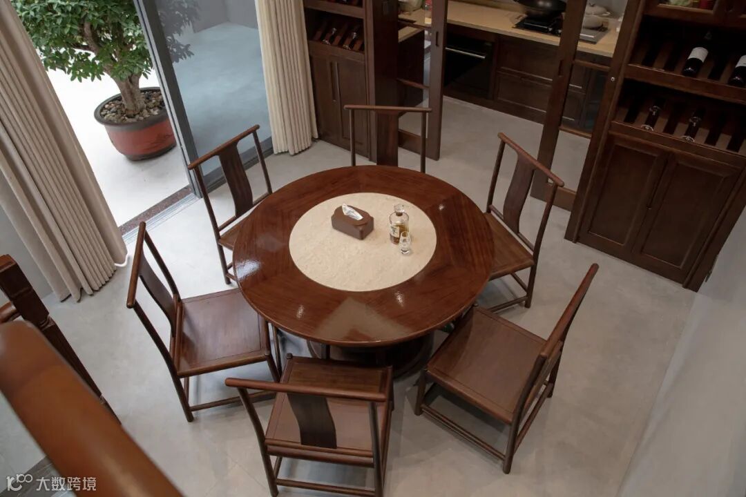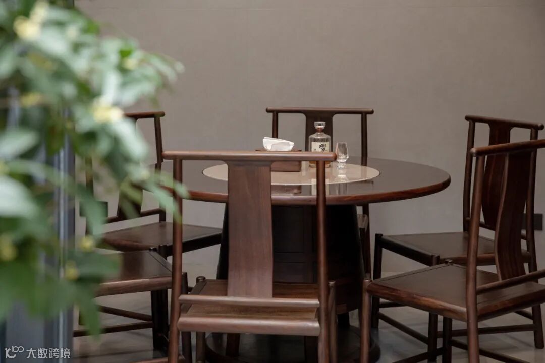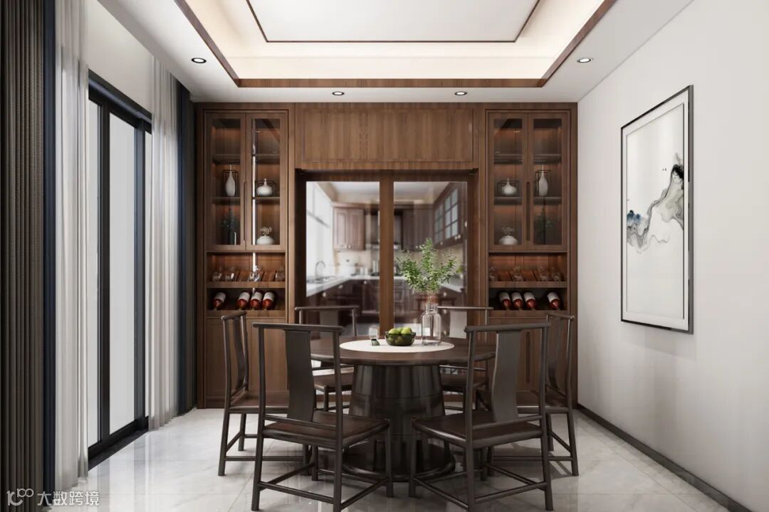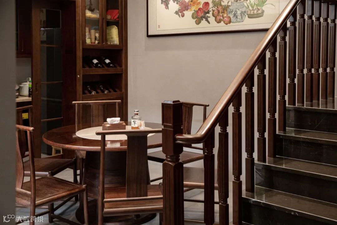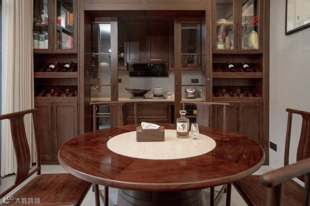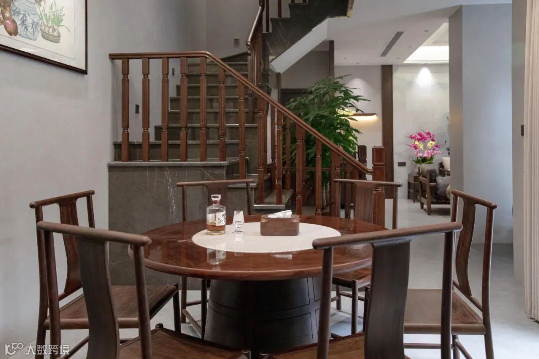 餐厅讲究“团圆”,设计师巧妙地运用黑檀木大圆桌在空间中形成“天圆地方”的意境表达,回归到团圆美满的生活本真。