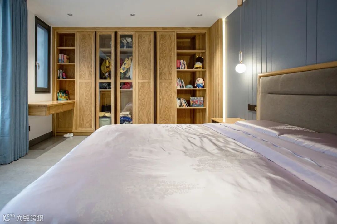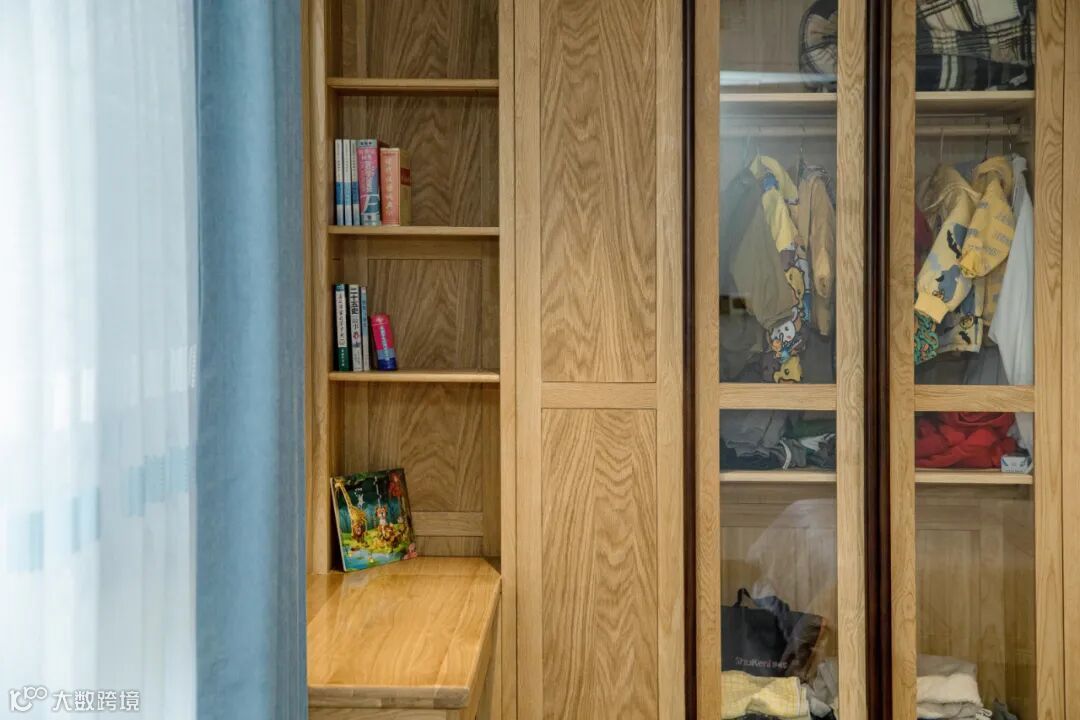 儿童房在设计基础上做了调整,取消挂式书桌,设计了衣物与书籍收纳一体的定制柜体,结合简易书桌和单椅,打造一个融合休憩、学习、收纳的空间。