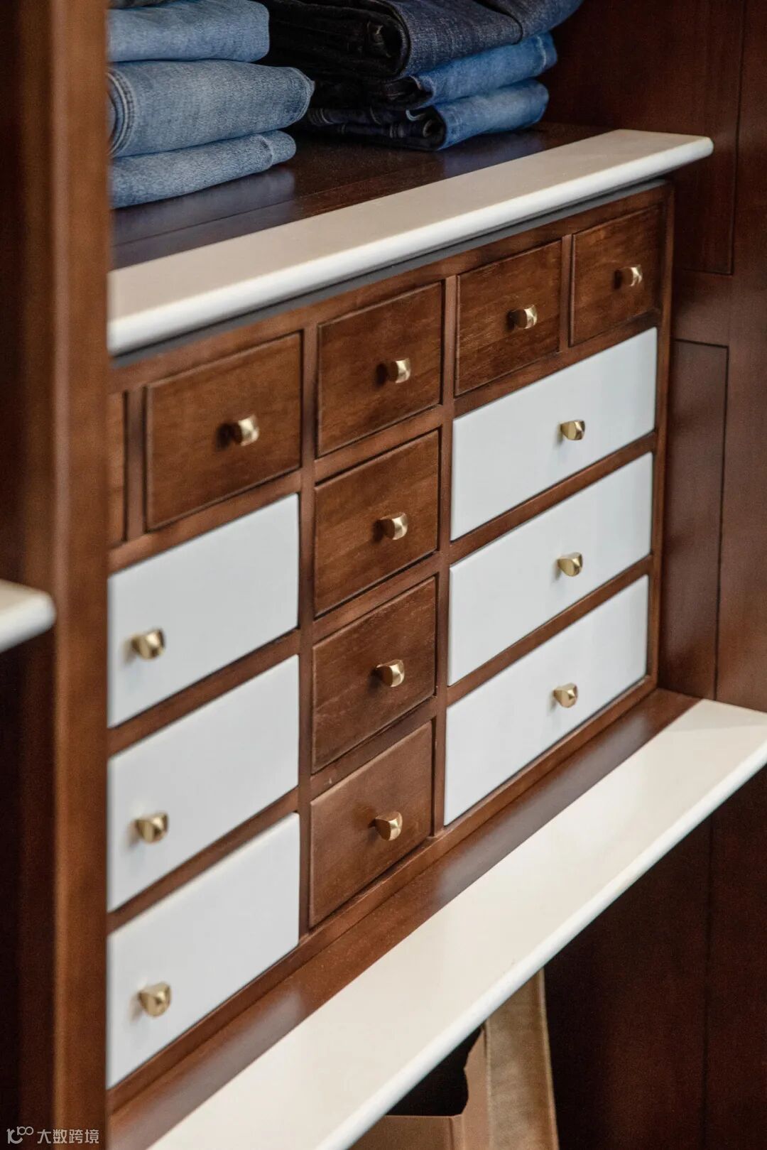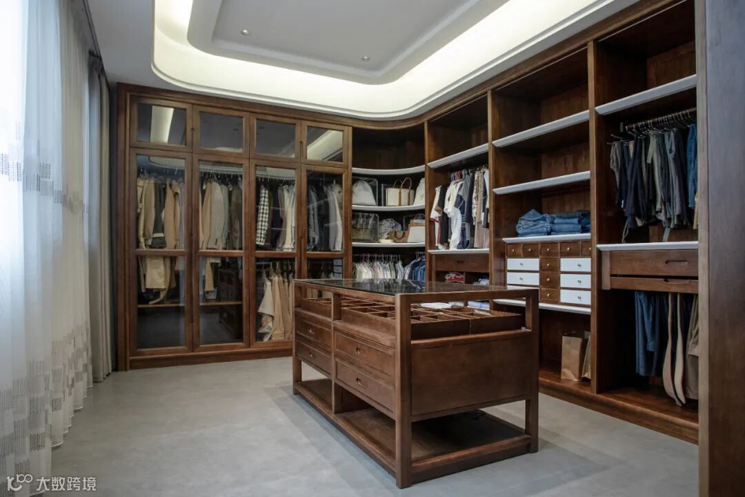 敞亮的衣帽间,衣物分区整齐有序,储物类型开放式与隐藏式兼具,功能齐全。中岛柜对于首饰的存储和展示恰如其分,同时增设细致的灯带,拿取便利。