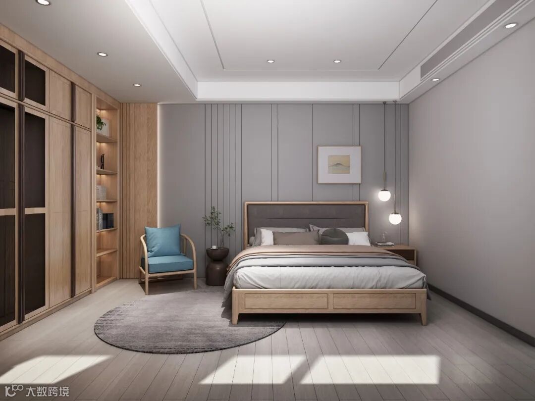 整个空间以灰白色为主,简洁大方,大面积的留白,减少造型体现,以实木的线条感来表达现代简洁的设计语言。
