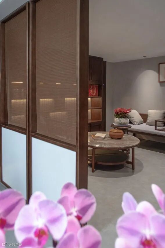 另于阁楼空间以黑檀木的沉静特性布景,若隐若现的屏风将外界的喧嚣隔绝在外,黑灰色调营造朴素的氛围,搭建了一个闲适的人文空间。