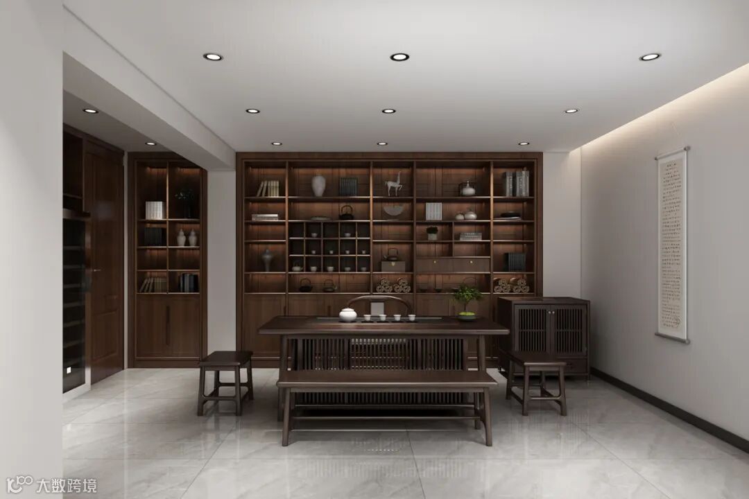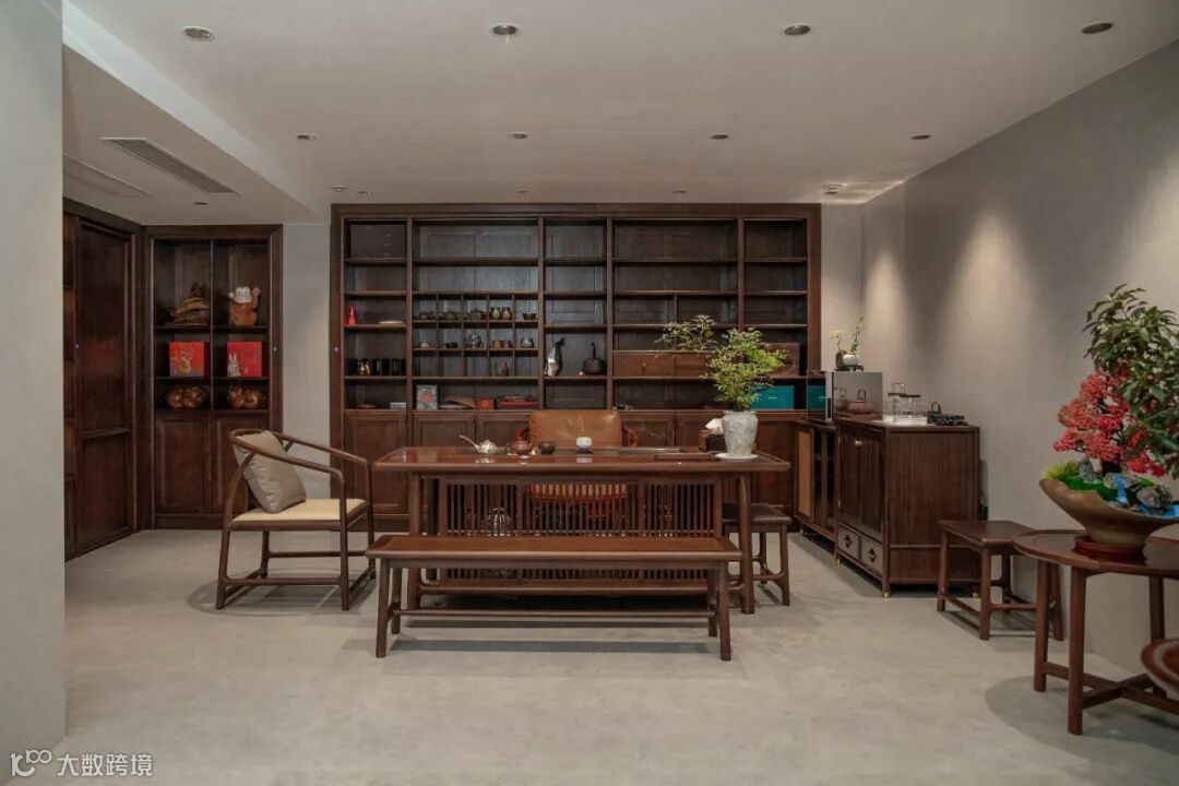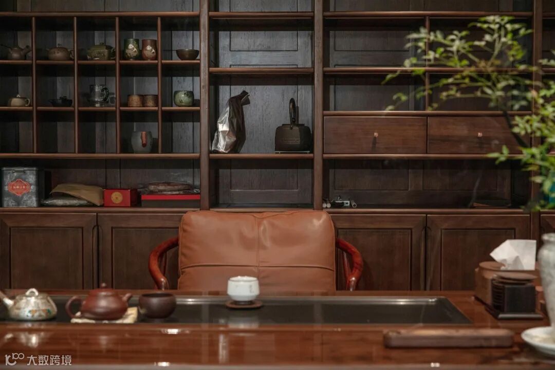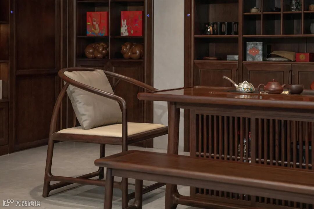 茶空间,用黑檀木的静和雅给予人们平和下来的力量。茶台简易的直棂设计舒缓了空间的沉闷氛围,呈现出静雅的饮茶环境。