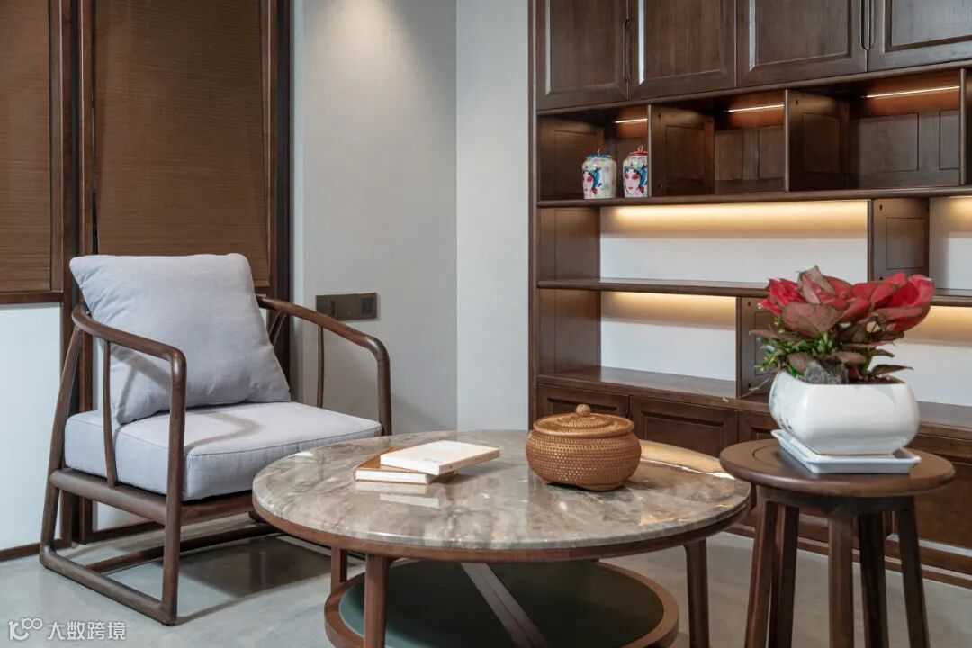 定制柜体与空间结构完美贴合,或陈列好茶,或珍藏陈酒,或摆放饰物,木香融合着茶香酒沁,可窥见户主藏物惜物之情。