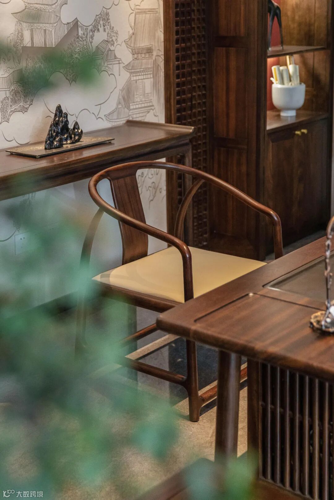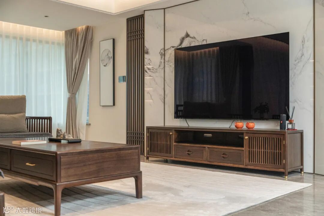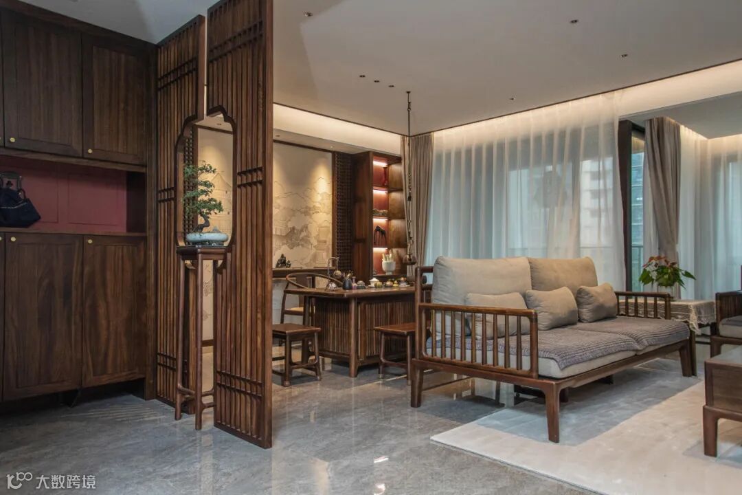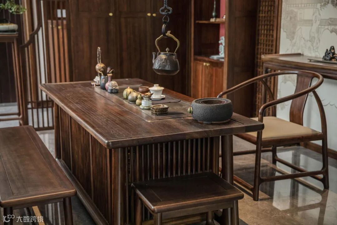 公共空间的设计要点在于开阔明亮,保持整体的统一性与和谐性,黑檀木沙发与茶桌静默对话,彰显出东方的待客之道。