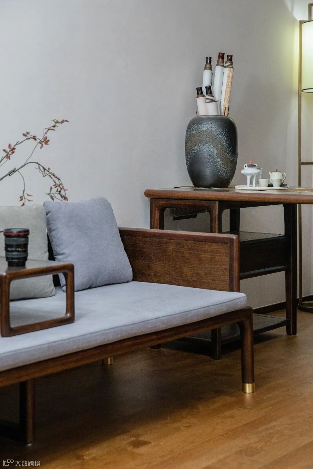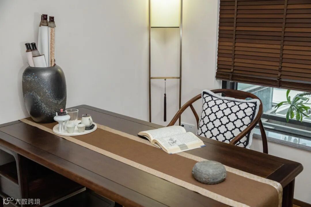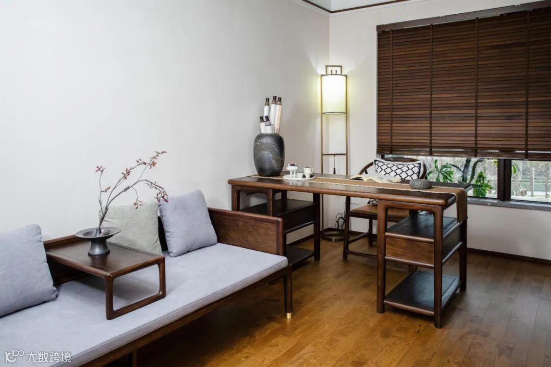 一张书桌,一张罗汉榻,极简的设计显现出木作线条的美感,搭配东方元素软装和饰品,整个空间极具文人雅致的气息。
