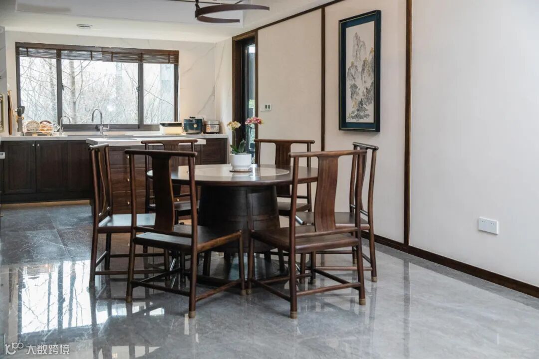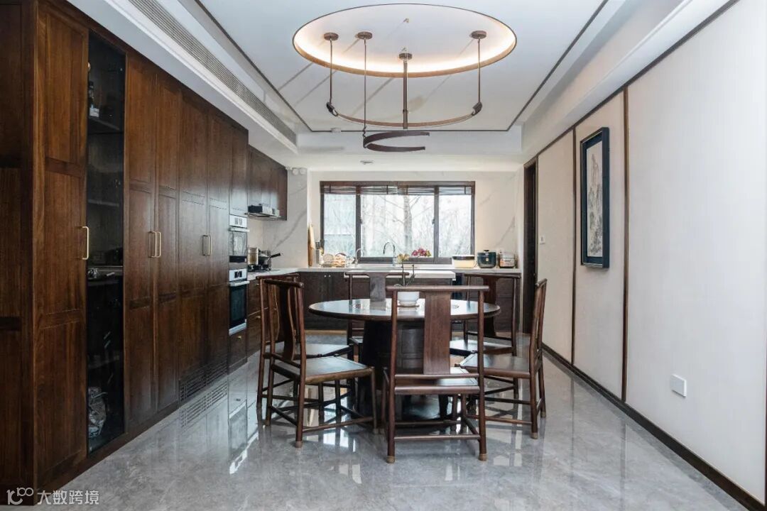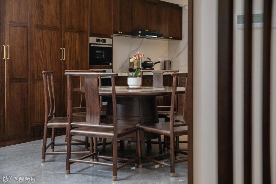 大圆桌统一调性,造型融入传统文化元素“鼎”,黑檀木的温润质感使得用餐成为一件自然惬意的事情。
