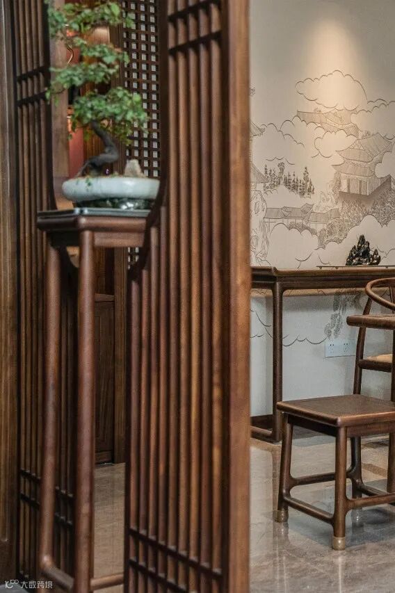 格栅样式设计保证了空间的流动性,也增添了神秘感。中间镂空,置放绿植,起到了一个入户造景的作用,更加灵动。
