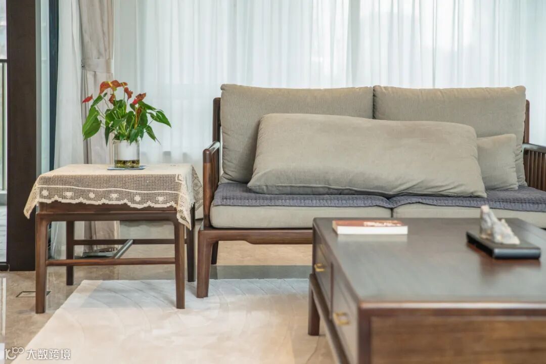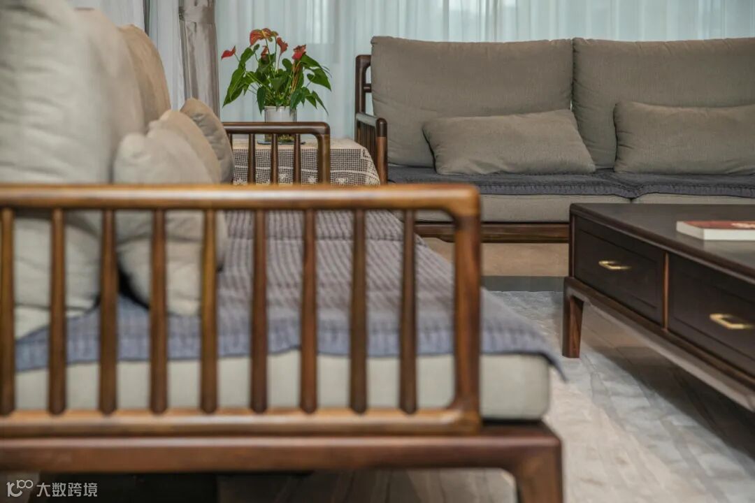 客厅沙发选用的是妙境沙发,通体的直棂元素设计,呈现出一种虚实相间,通透无余的空间感。每一次落座,都能感受到木作带来的温度。