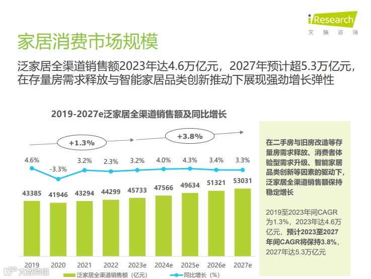 为全面解析中国家居消费市场的特征,预测家居消费动向与发展趋势,在商务部流通产业促进中心的指导下,全联家具装饰业商会、居然之家、艾瑞咨询共同编写《2024年中国家居市场消费洞察》,并于2024年4月25日正式发布。报告显示,泛家居全渠道销售额2023年达4.6万亿元,2027年预计超5.3万亿元,在存量房需求释放与智能家居品类创新推动下展现强劲增长弹性。