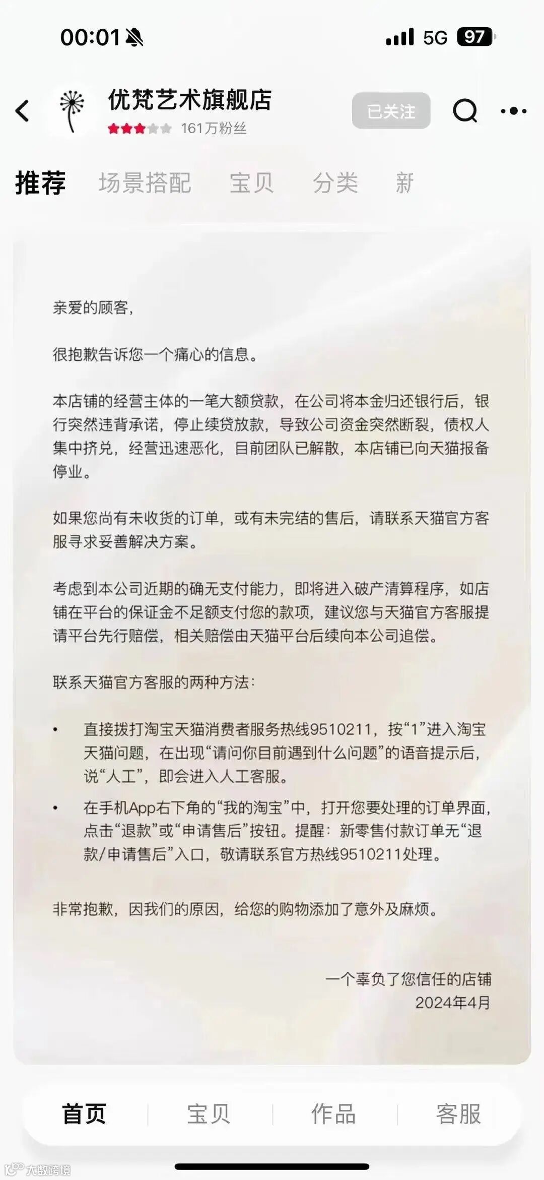 4月21日,知名家居品牌优梵艺术在淘宝店铺公告,因银行停止续贷放款,公司资金链突然断裂,债权人集中挤兑,导致经营迅速恶化,目前团队已解散。并称公司已无支付能力,即将进入破产清算程序。