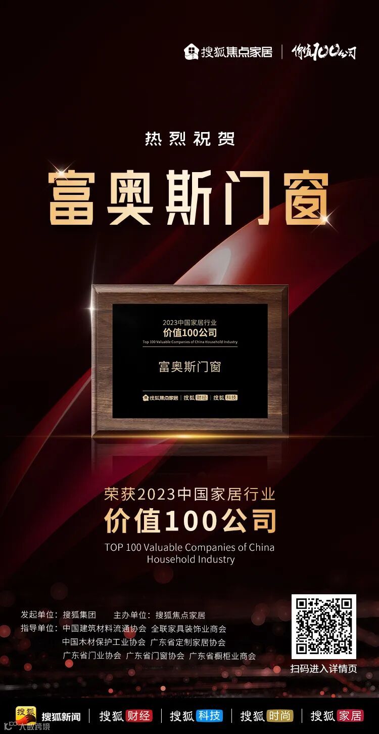 富奥斯门窗深耕行业22年,一直专注于产品创新,拥有发明专利、国家实用新型专利和外观设计专利近400项,先后研发出斜压线、防脱落、可拆卸安全格等专利,创下行业众多先进技术。富奥斯门窗秉持着“以科技为驱动 连接美好生活”的品牌理念,同时充分发挥自身技术优势,积极参与国家、行业标准的制定,推动门窗行业的蓬勃发展,并最终荣获“2023中国家居行业价值100公司”大奖!