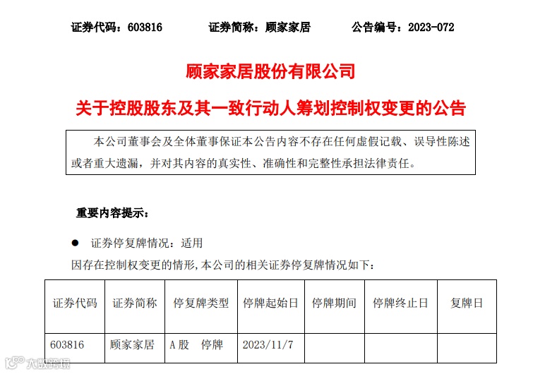 鉴于上述事项尚存在不确定性,为保证公平信息披露,维护投资者利益,避免造成公司股价异常波动,经公司向上海证券交易所申请,顾家家居于11月6日早间申请紧急停牌,并在11月7日继续停牌。