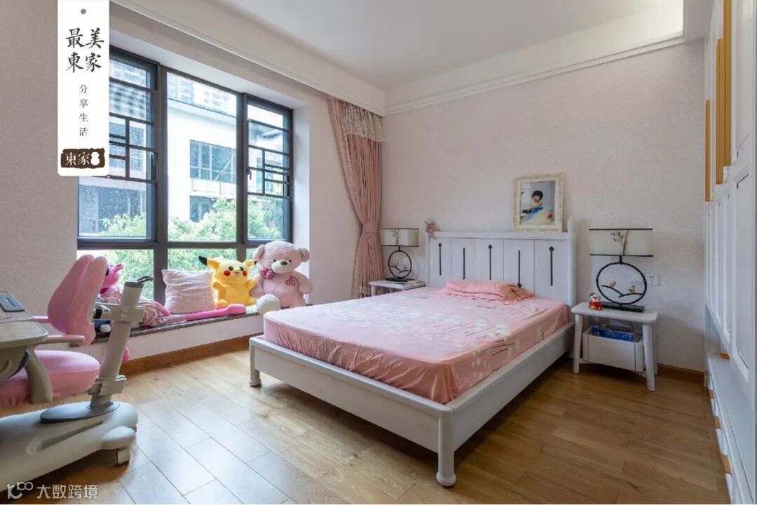 主卧的对面是儿童房,粉红的色调,搭配东家专为青少年设计的新中式家具,据说每一个女孩子心里都有一个公主梦。床头背板上的毛笔图案,墨竹与灵鸟造型的台灯,一动一静,契合房间主人的性格基因,陈太太说,妹妹热爱阅读,家里的书柜一半都是她的书;同时也是动手能力很强的孩子,平日里,喜欢看视频学做美食,味道甚至比妈妈做得还好;妹妹的兴趣爱好也是相当广泛,平时喜欢弹钢琴与画画。