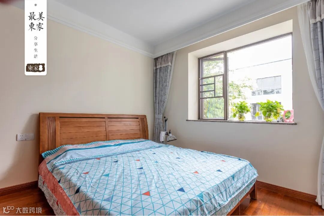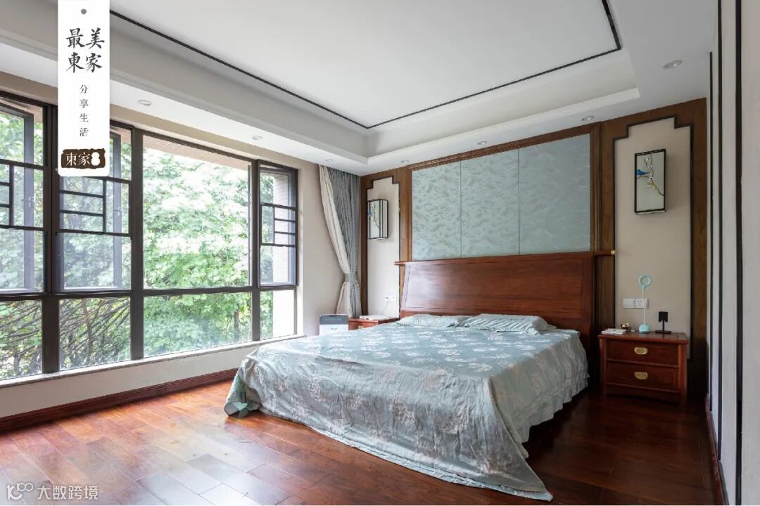 别墅的二楼,分布着主卧和两个次卧。主卧的风格,同样是新中式的设计,床单和背景墙,都选用了统一颜色——天青色,这种只有在雨后初晴才能求得一见的颜色,清澈、干净、纯洁如水,就像陈太太与丈夫的爱情:当年两人在工厂打工相识,后来陈先生离开工厂独自创业,陈太太二话不说跟随着他,一路陪伴至今。没有命中注定的巧合,没有跌宕起伏的情节,只有衷心的陪伴,如细水长流。
