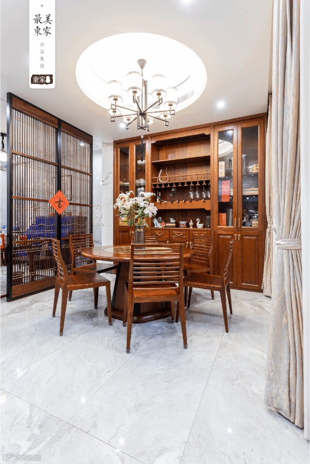 在这点上,陈太太最满意的是餐厅与客厅之间的隔断设计。由于室内的承重柱位于客厅,陈太太希望餐厅和客厅之间能做一个隔断,避免孩子在吃饭时受到电视等影音的干扰,一家人能够坐在一起专心享受用餐的时光,但该户型以柜体为隔断,会严重影响室内的采光与通风。为此,东家设计团队为陈太太定制了一扇实木屏风,以古代的栅栏为灵感打造的屏风,既拥有东方的雅致情调,又保证了空间上的采光性。