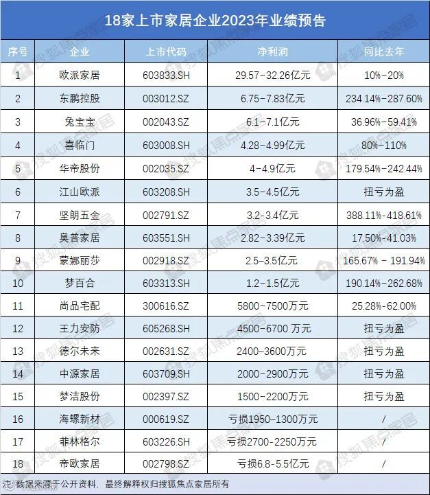 蒙娜丽莎、梦百合、华帝股份、东鹏控股,2023年净利同增基本保持在200%左右,而坚朗五金预计2023年归属于上市公司股东的净利润3.2-3.4亿元,更是比上年同期增加388.11%-418.61%。