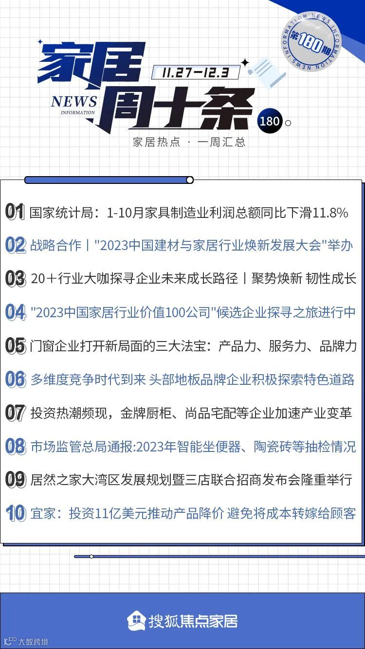 11月27日,国家统计局发布2023年1-10月份全国规模以上工业企业利润数据报告。数据显示,1-10月,家具制造业营业收入为5127.9亿元,同比下降6.6%;营业成本4227亿元,同比下降7.9%;利润总额247.1亿元,同比下降11.8%。