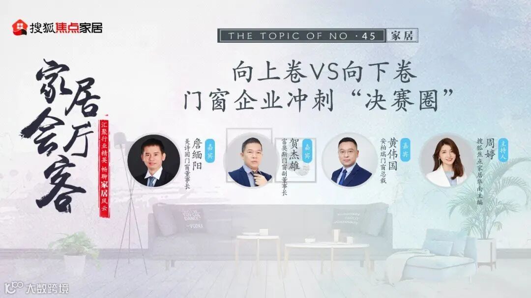 11月24日,由搜狐焦点家居主办的《家居会客厅》——“向上卷VS向下卷——门窗企业冲刺‘决赛圈’”为主题的对话沙龙在广州搜狐媒体中心举行。富奥斯门窗副董事长贺杰雄、美诗固门窗董事长詹缅阳、安柏瑞门窗总裁黄伟国,家居行业3位大咖代表做客搜狐直播间,对话搜狐焦点家居华南主编周婷,就门窗企业如何通过转型升级实现产业优化提质,开创门窗产业新格局展开分享讨论。