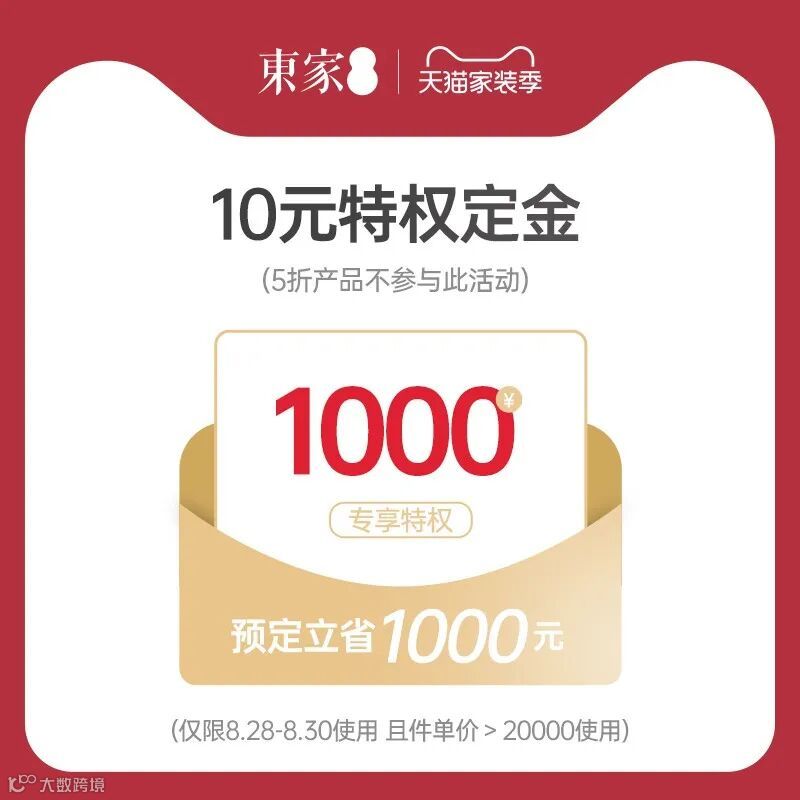 8/25-8/30期间购买10元特权订金,在8/28-8/30期间店铺消费满20000元,即可立省1000元。相当于10块钱当1000元使用!