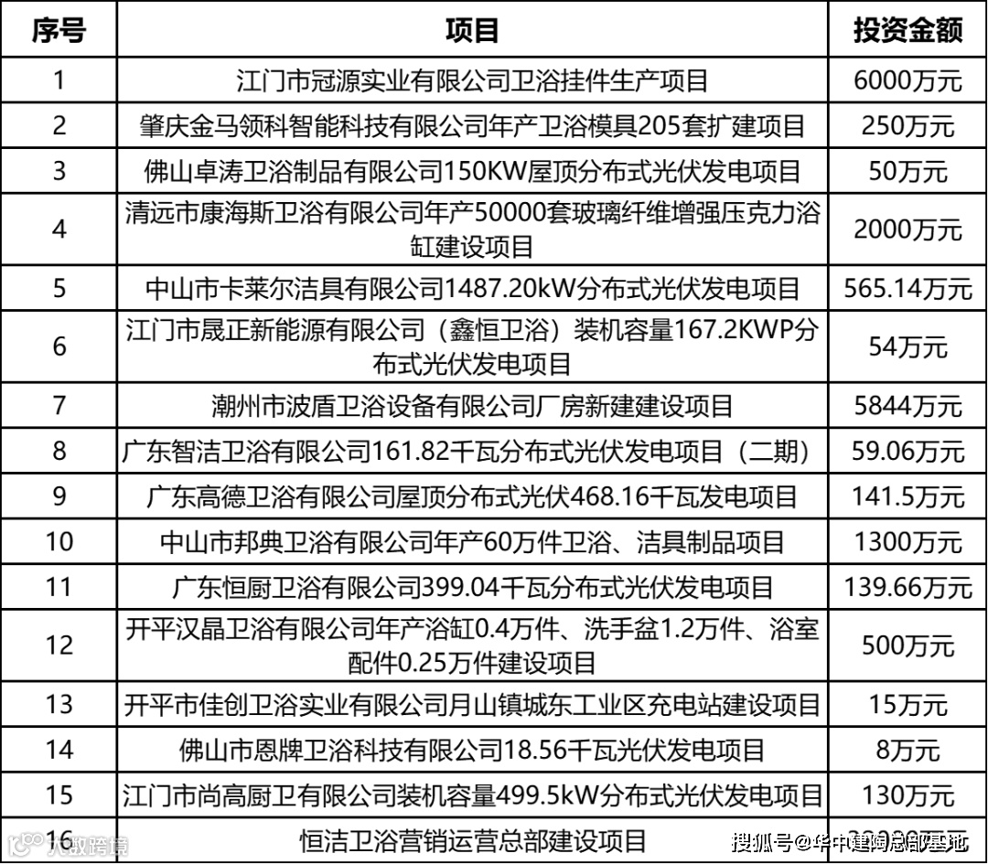 据广东省投资项目在线审批监管平台公示的信息显示,11月共有16个卫浴洁具相关的新项目备案复核通过,其中包括卫浴挂件生产项目、卫浴模具扩建项目、厂房新建项目、营销运营总部建设项目、光伏发电项目等,总投资49,056.36万元,涉及恒洁卫浴、清远市康海斯卫浴、开平汉晶卫浴、中山市卡莱尔洁具、中山市邦典卫浴、江门市冠源实业、肇庆金马领科智能科技、佛山卓涛卫浴制品、鑫恒卫浴、潮州市波盾卫浴设备、广东中湛电能科技、广东高德卫浴、广东恒厨卫浴、开平市佳创卫浴实业、佛山市恩牌卫浴科技、江门市尚高厨卫等企业。