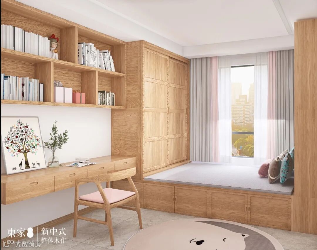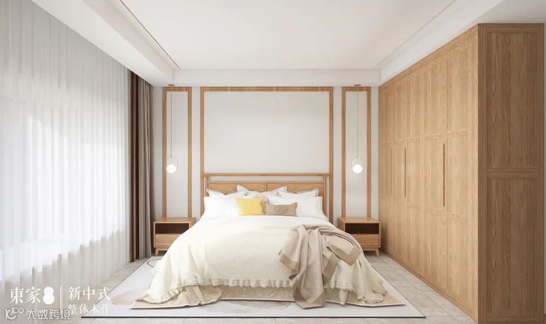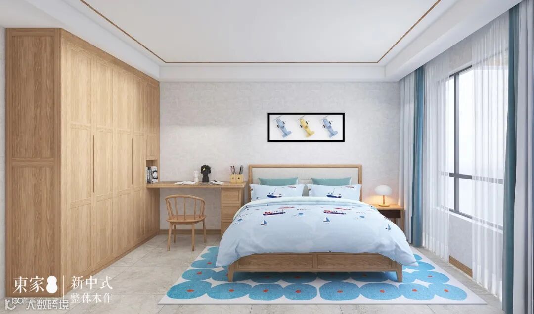 主卧与次卧采用类似的布局,东家整体木作定制的封顶衣柜,不仅解决大容量的衣物收纳问题,而且提升了整体空间的颜值,为卧室风格定下新中式格调。值得注意的是,设计师对次卧进行了别出心裁的设计,衣柜局部镂空的处理,为孩子搭建了一套精致的学习书桌,体现了设计师对居住需求的理解细致入微。