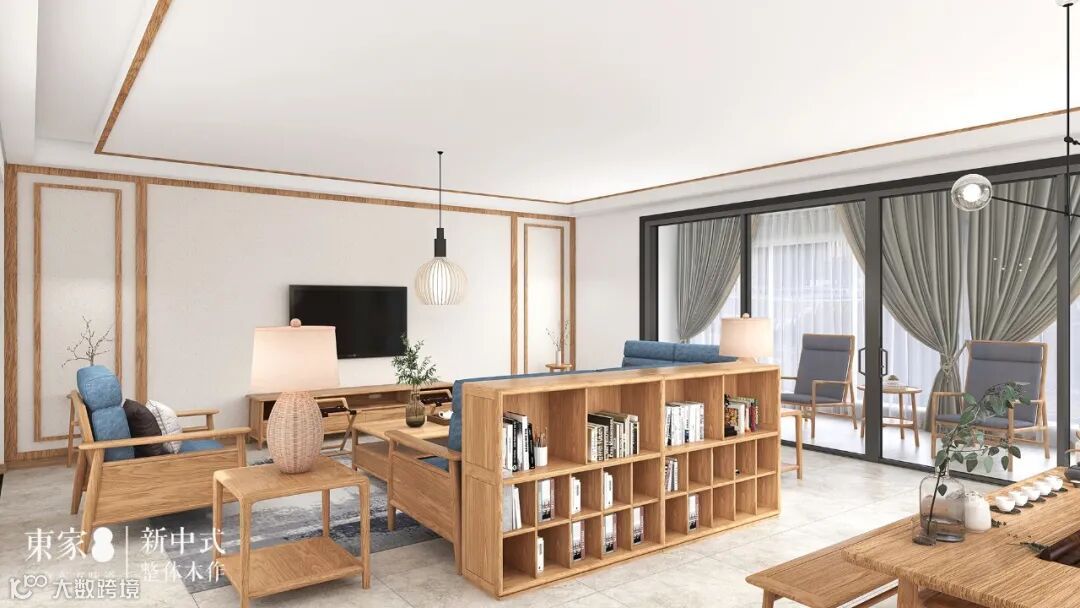 设计师为业主打造了50+m²的超大客厅,不仅拥有视听区、阅读区、品茶区,推开通透的落地大窗,阳台上布置一套舒适的座椅,在休闲区里享受生活的闲情逸致。沙发等高的的定制落地书柜,既保证了客厅的开阔视野,也提供大容量的收纳空间,存放孩子的书籍与玩具。