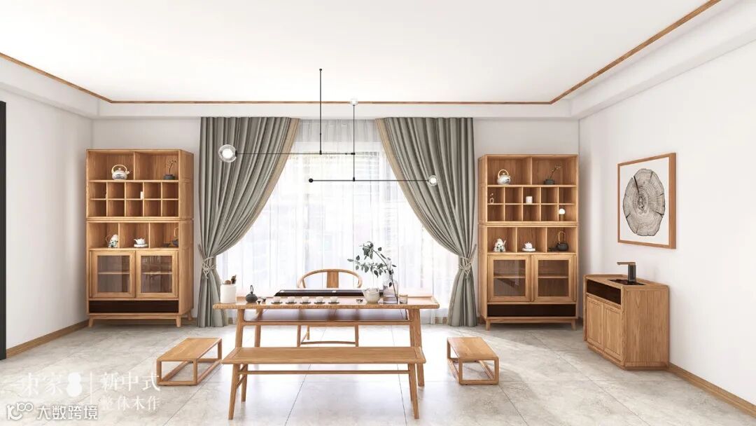 品茶区连通客厅,取消了隔断,最大程度地提升了客厅的采光度。品茶区遵循了客厅的统一设计原则,两侧对称的储物柜,囤放着业主收藏的茶叶与器皿。设计上讲究实用性,同时也不失中式的韵味。