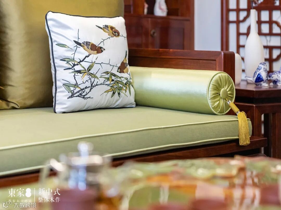 客厅是会客的场所,设计师运用东家·花梨院子的产品将客厅打造成一所别致小院,喝茶聊天,舒适怡然。花梨木家具质感温润如玉,纹理行云流水和柳绿色坐垫的搭配,给人一种碧玉妆成的感觉,十分柔和协调。镂空雕花的软装,线条流畅,转折灵活,形象生动。