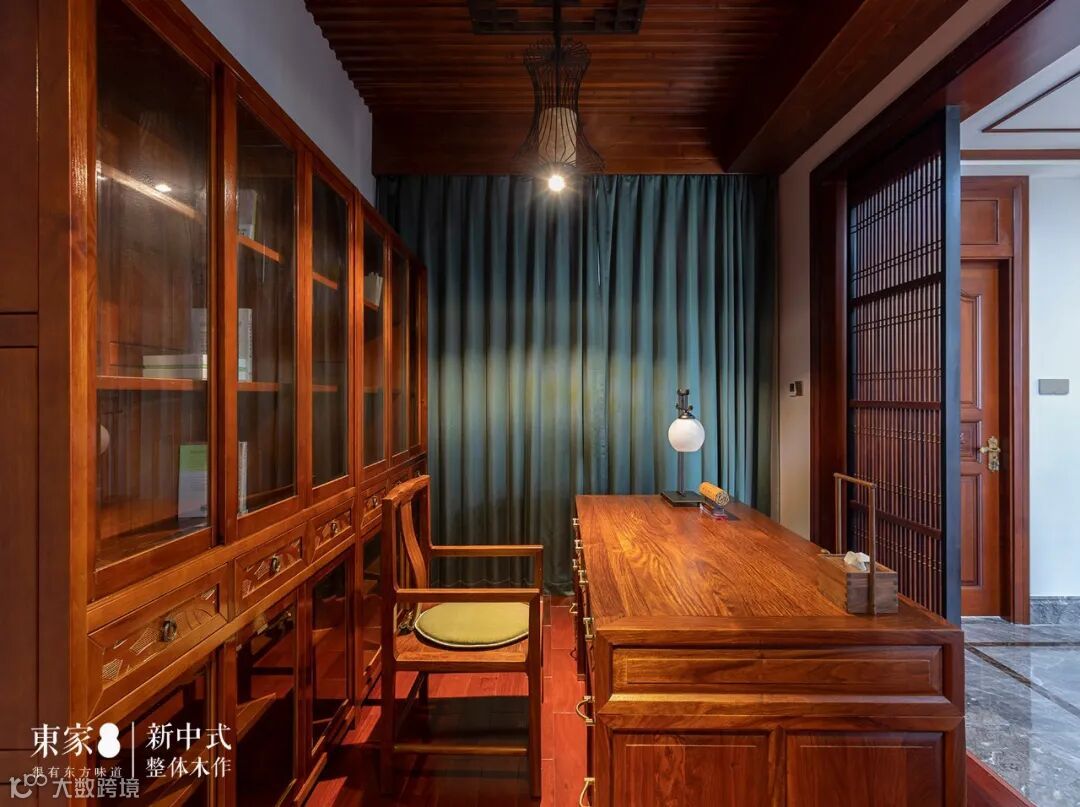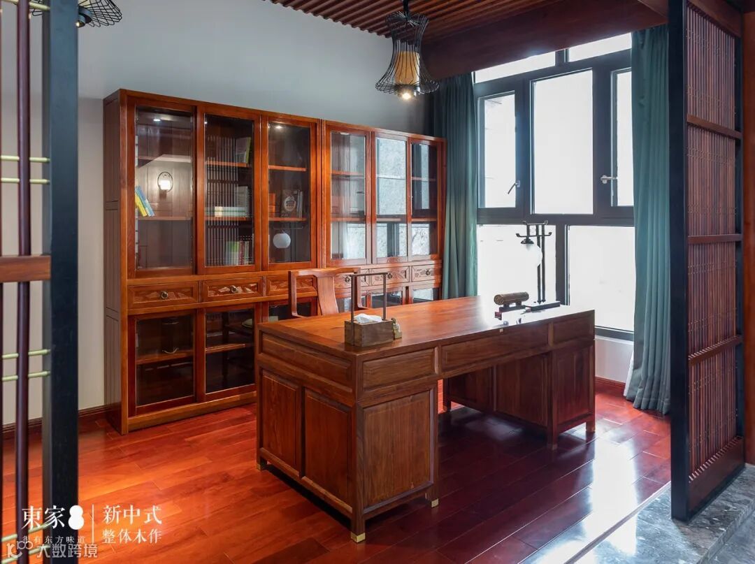 同样的窗棂设计运用到书房不仅完美呈现了中国古典建筑的对称美学,而且增大了书房视觉空间,东家组合书柜与书桌纹理清晰、色泽优雅,金属铜脚包边四平八稳,表现出主人家沉稳儒雅的气质。
