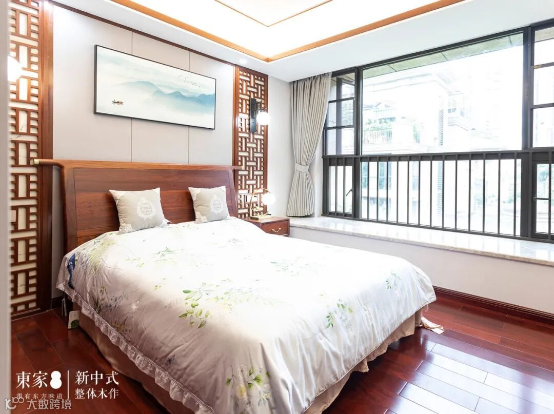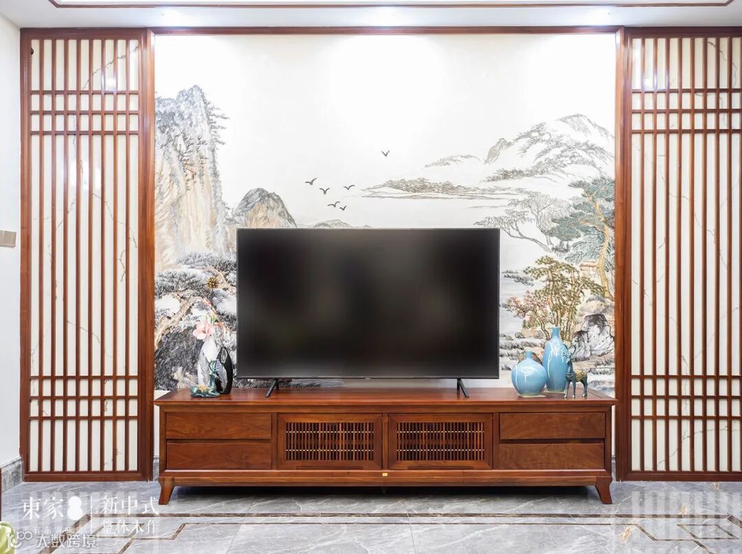 窗棂设计的视听柜和软装与中国山水画的组合搭配将中国画的那种高远意境表现的淋漓尽致,就像是打开房门那种美妙的自然风景和鸟语花香慢慢的在感官中呈现开来。