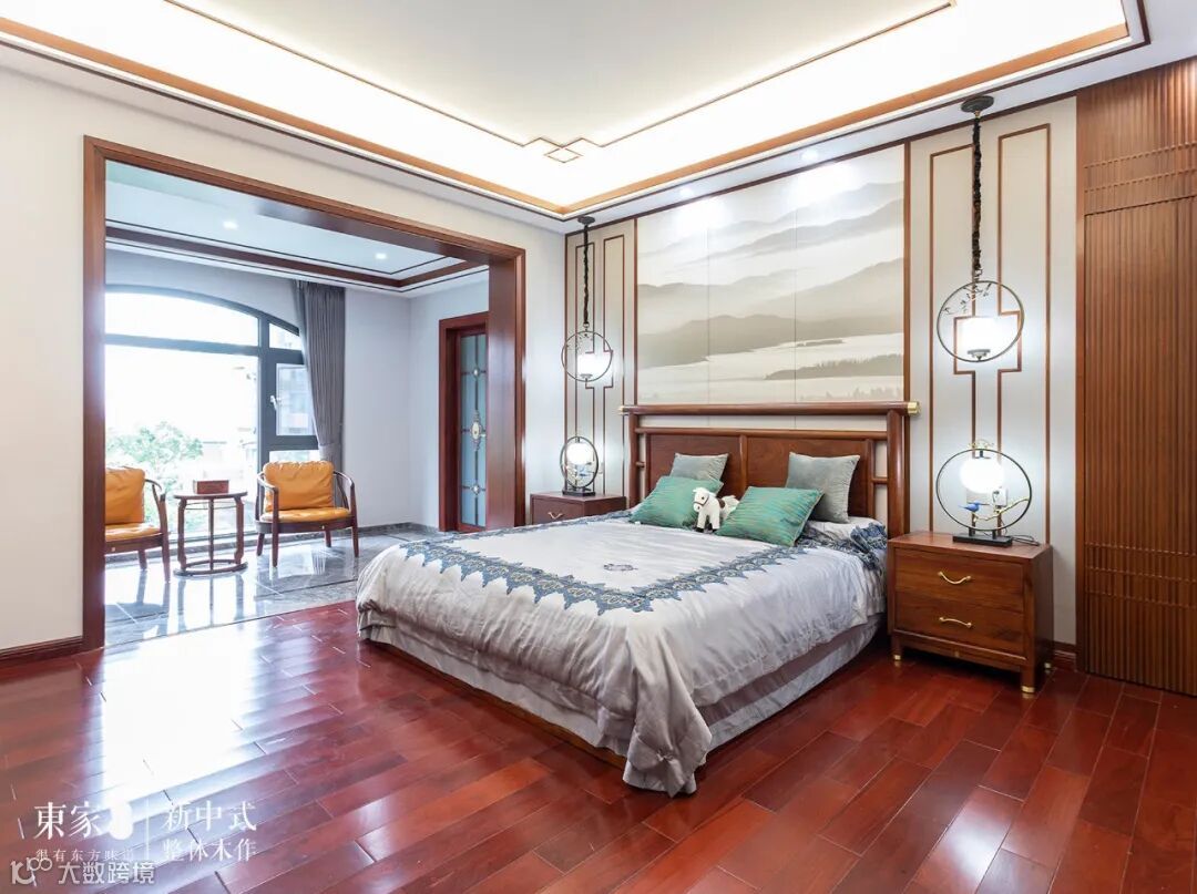 卧室秉承中式风格的浓浓古韵,床位处的山间水墨画与床头上下灯饰交相呼应,使整个空间如同一幅缓缓打开的山水画卷,俊秀清丽,晨曦日落光影交替变换,动态光影的行进中,空间有了更加立体而生动的表情。