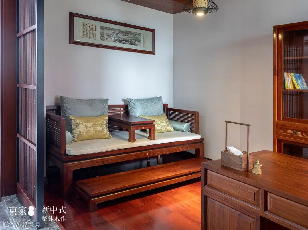 摆放在书房的罗汉床,也十分的贴心,读书困倦的时候,可以坐在舒适的罗汉床上小憩片刻。古色书香,方寸之间可见万千;绿韵生香,旦夕之间可赏明月。
