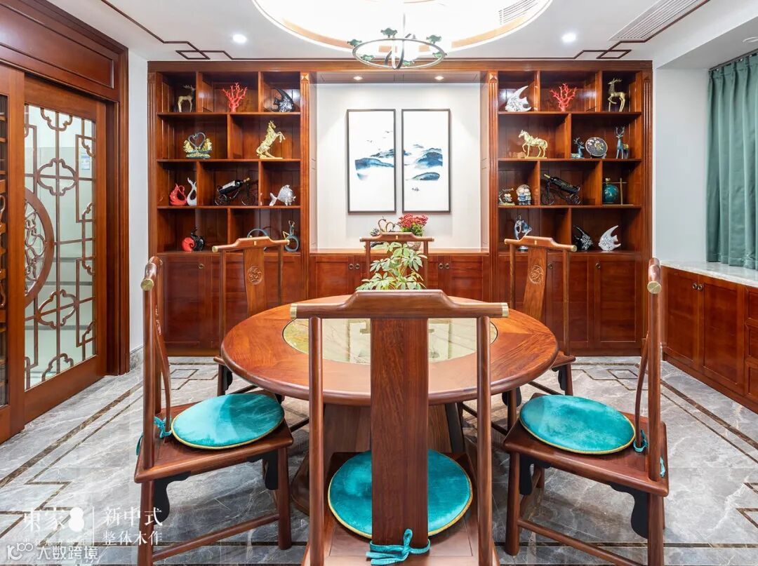 东家全屋定制的餐厅结合中式风格所讲究的对称性,设计师用对称收纳柜组合满足了这一点要求,地板线条与天花线条相呼应,中间山水画更是起到了画龙点睛的作用。