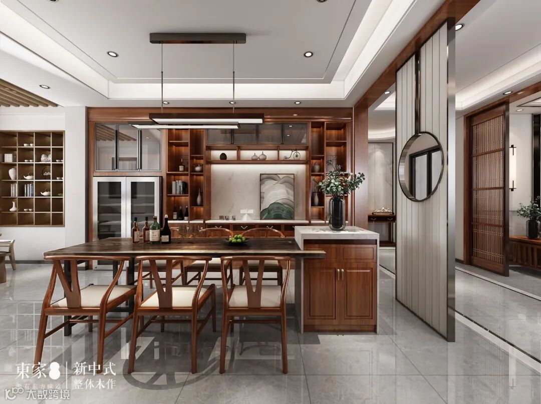 餐厅朴素自然的黑檀木大板餐桌,通过与大理石面的花梨柜体结合形成中岛台式餐桌,深浅色调的配色,表达出不同材质融合的魅力,使得每个家具独立而不孤立。顶墙餐边柜,兼具装饰、收纳的职能,内嵌的红酒恒温柜,彰显主人轻奢的生活品味和格调。