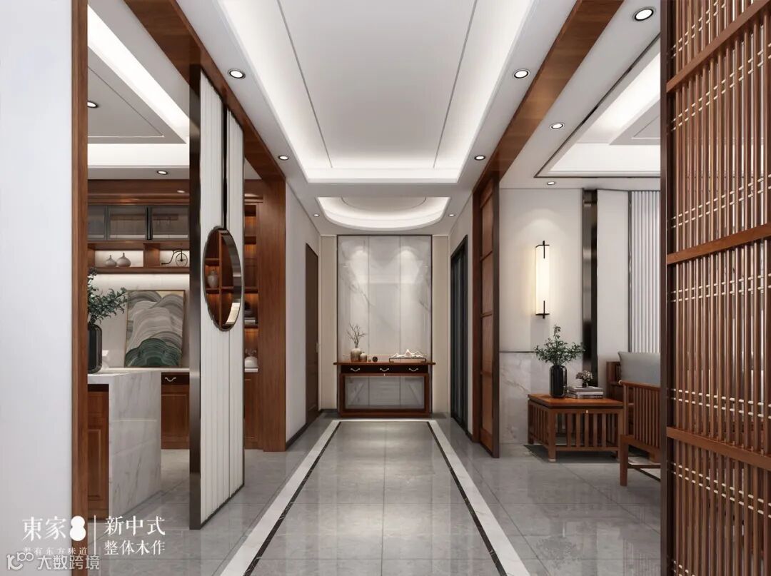狭长的过道穿梭于整个空间,给人一种曲径通幽的感觉,地面简洁的波导线划分了餐厅与客厅的区域。浅色吊顶和内嵌的灯光,让走道变得宽敞明亮。走廊尽头别致的玄关摆件,给过道增添了一份恬淡优雅的美。