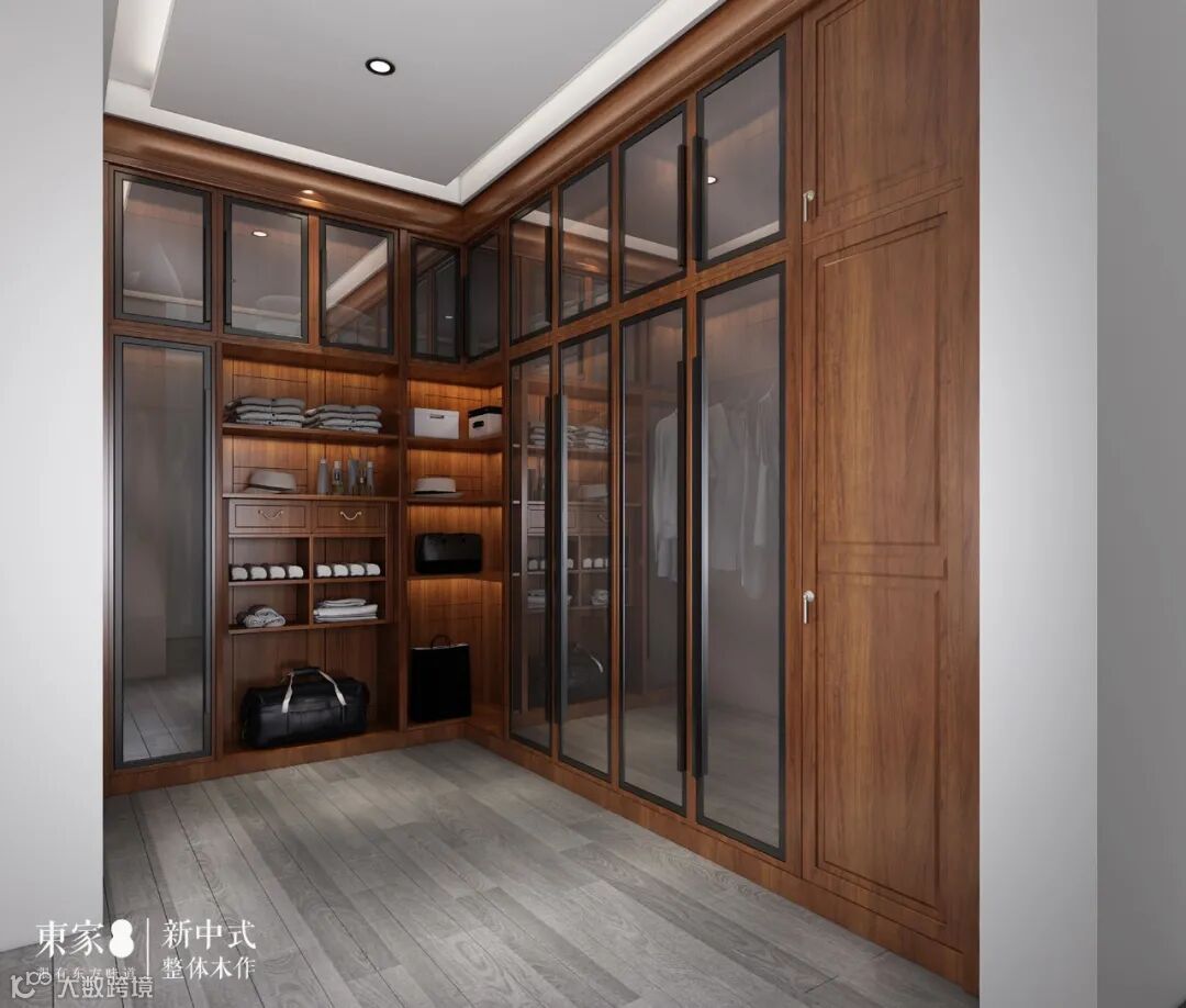 主卧配备的花梨木材质的独立衣帽间,保持了家居风格的美观和整体性。整面墙作的L型衣帽间搭配内嵌的灯带的设计,最大限度地利用转角空间。半开放的衣帽间功能规划齐全,实现轻松分门别类收纳,让整个空间显得干净整洁。