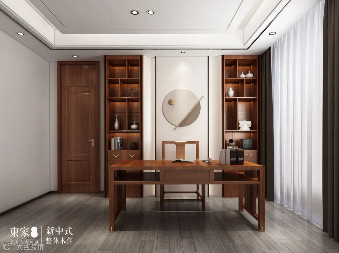新中式风格的书房,端庄素雅,它像是避开外界喧嚣的一处静谧。一套新中式风格的桌椅和对称的书架便可以打造一个书香沁心的书房,书架间现代元素的加入,避免了室内氛围过于庄重。在具有浓厚文化氛围的书房静心潜读,不失为现代家居生活中的一大享受。