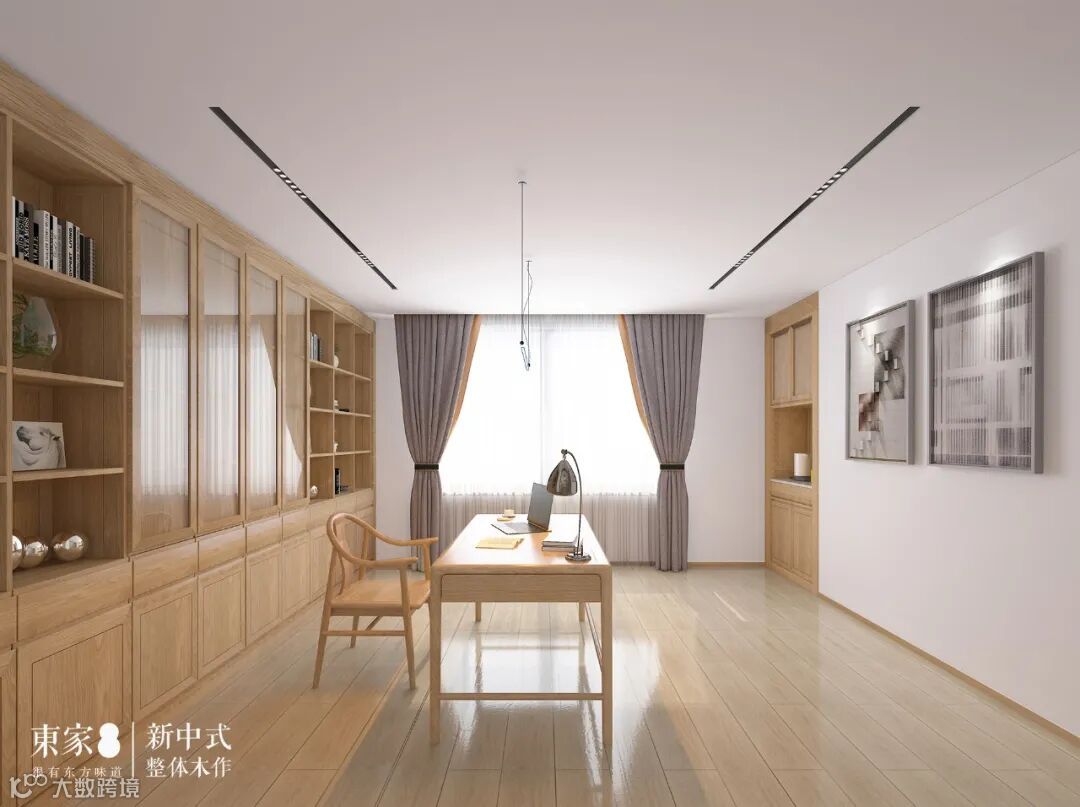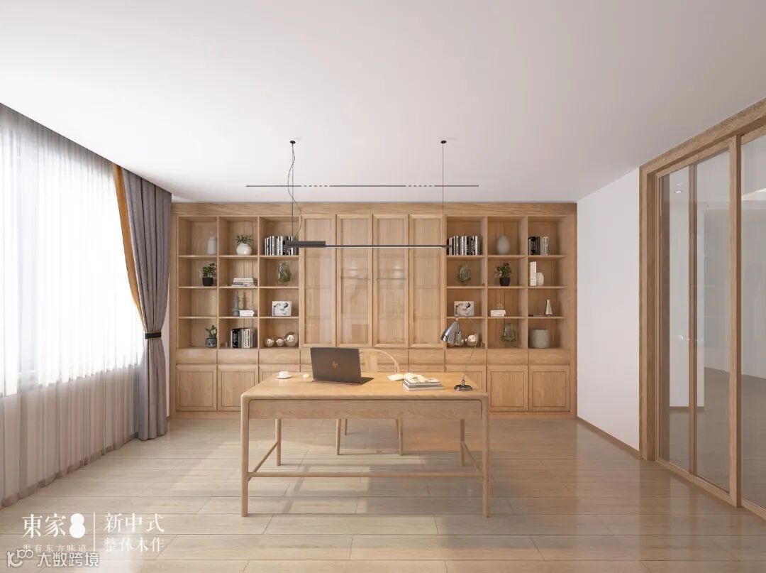 书房采用极简新中式风格进行摆设设计,大面积的木质书柜、书桌和扶手椅,传达出儒雅与宁静,让人不忍停留。