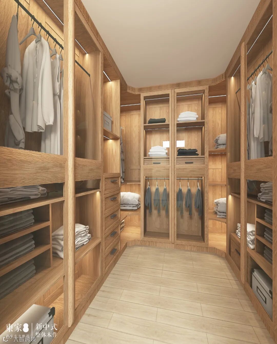 卧室另一侧,为男女主人延伸一个轻简舒适的衣帽间系统,规整而简洁线条,切割出大小不一的柜体空间,方便了日常拿取收纳。从收纳再到展示,再到整个木作细节处理,造型利落,把控着细腻空间视觉,带来舒适惬意的放松时刻。