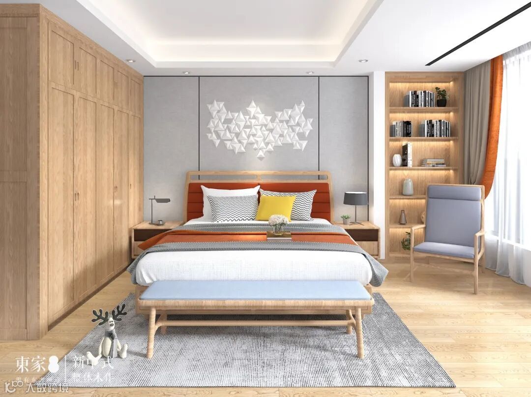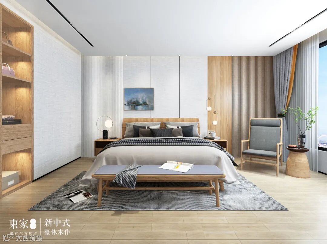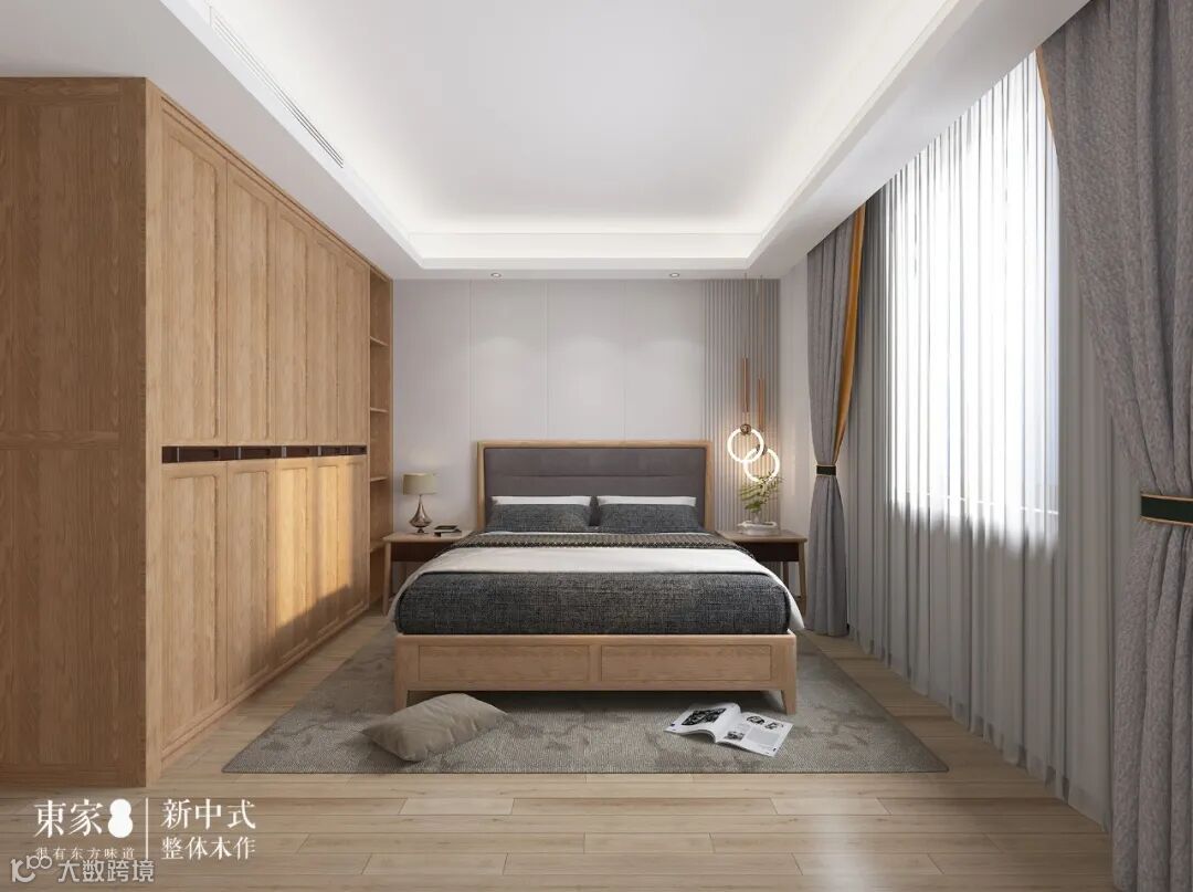 长辈房简洁硬包背景搭配富有自然肌理感的全实木纹理家具,碰撞出富有人文气息且具现代品质感的诗意禅韵。