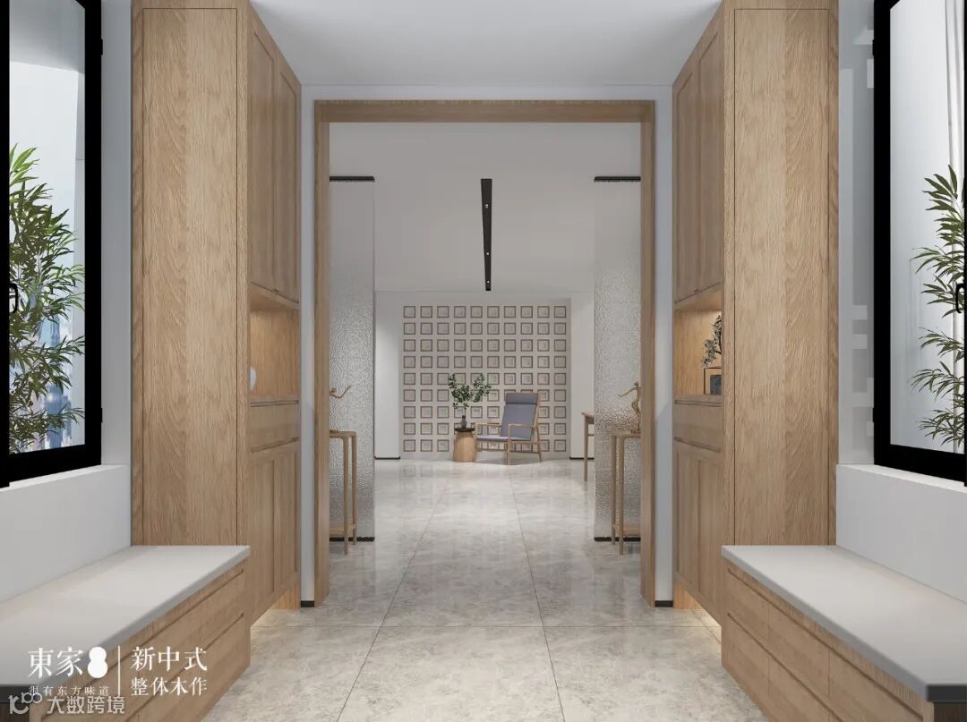 入门玄关,通透宽敞视觉,对称式的实木鞋柜,丰富了空间层次。鞋柜隔断内嵌感应灯,用于摆放盆景及生活用品,搭配新中式家具精致、简洁的形体,营造一种高贵的生活气息。