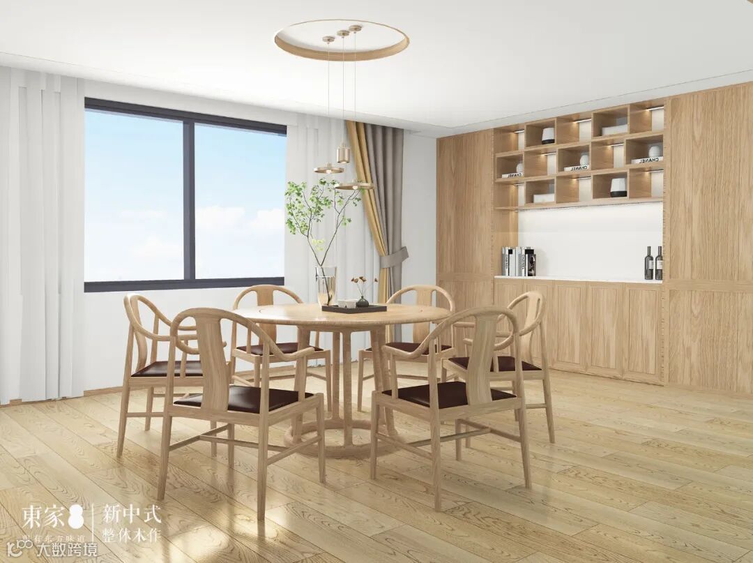 设计摄取“木”的力量与美,大面积铺陈温润的原木,利落的线条让餐厅氛围更统一,整柜木作定制、全实木餐椅、搭配金属吊灯,使画面纯粹富有诗意感。东家·青山橡餐桌将侘寂风自然融入新中式风格,完美贴合了中国人对生活美好期许。