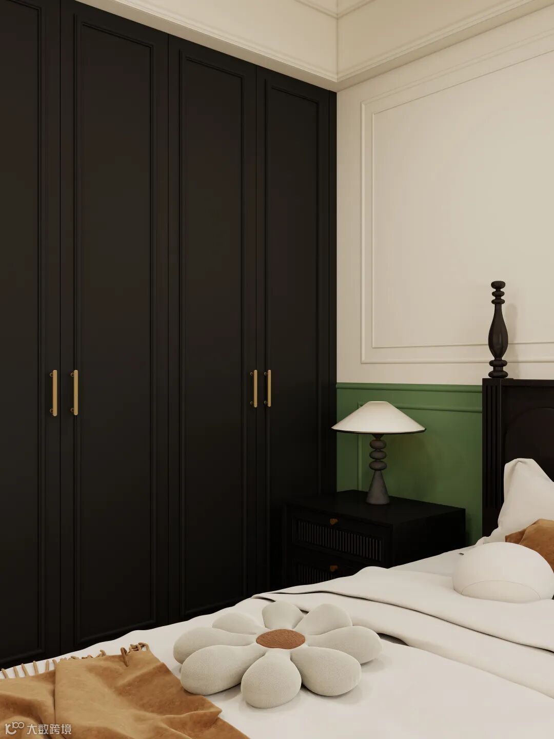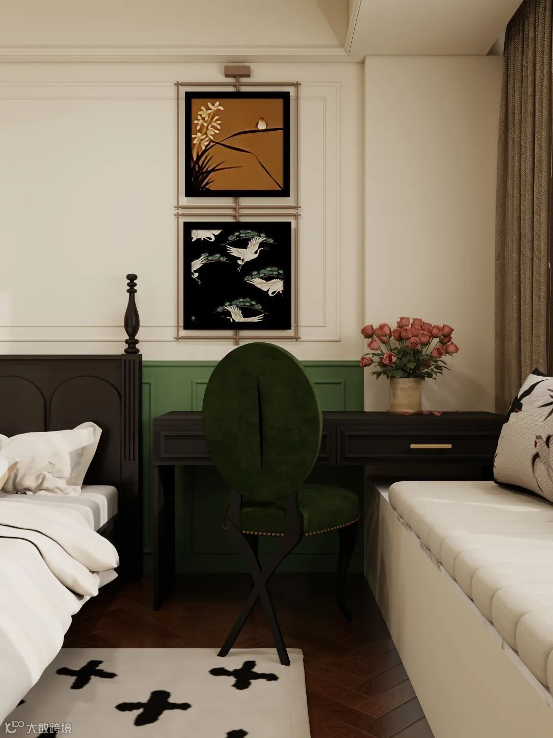 墙裙以苔藓绿作注脚,像将春日的苔痕裁了片贴在床侧,与深灰的柜体遥遥相和 —— 冷与暖、沉与柔,在呼吸间达成平衡。