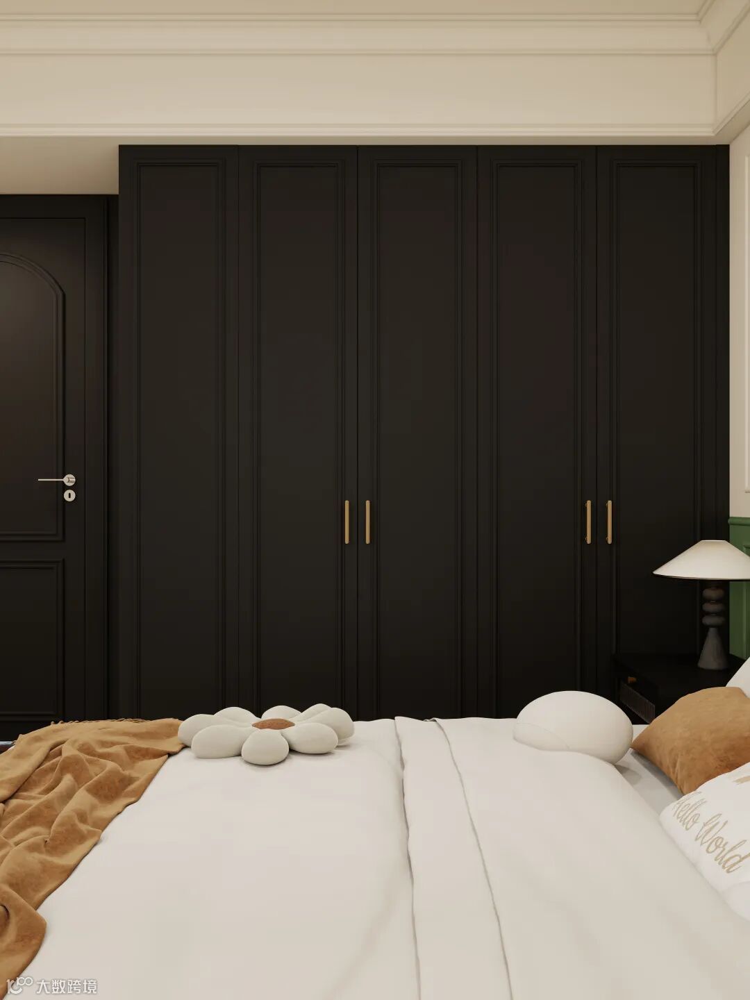 床品是蓬松的白,像落了层细雪,焦糖色的毯与花形靠枕又添了绒绒的暖意,让深灰的凛冽多了几分松弛。