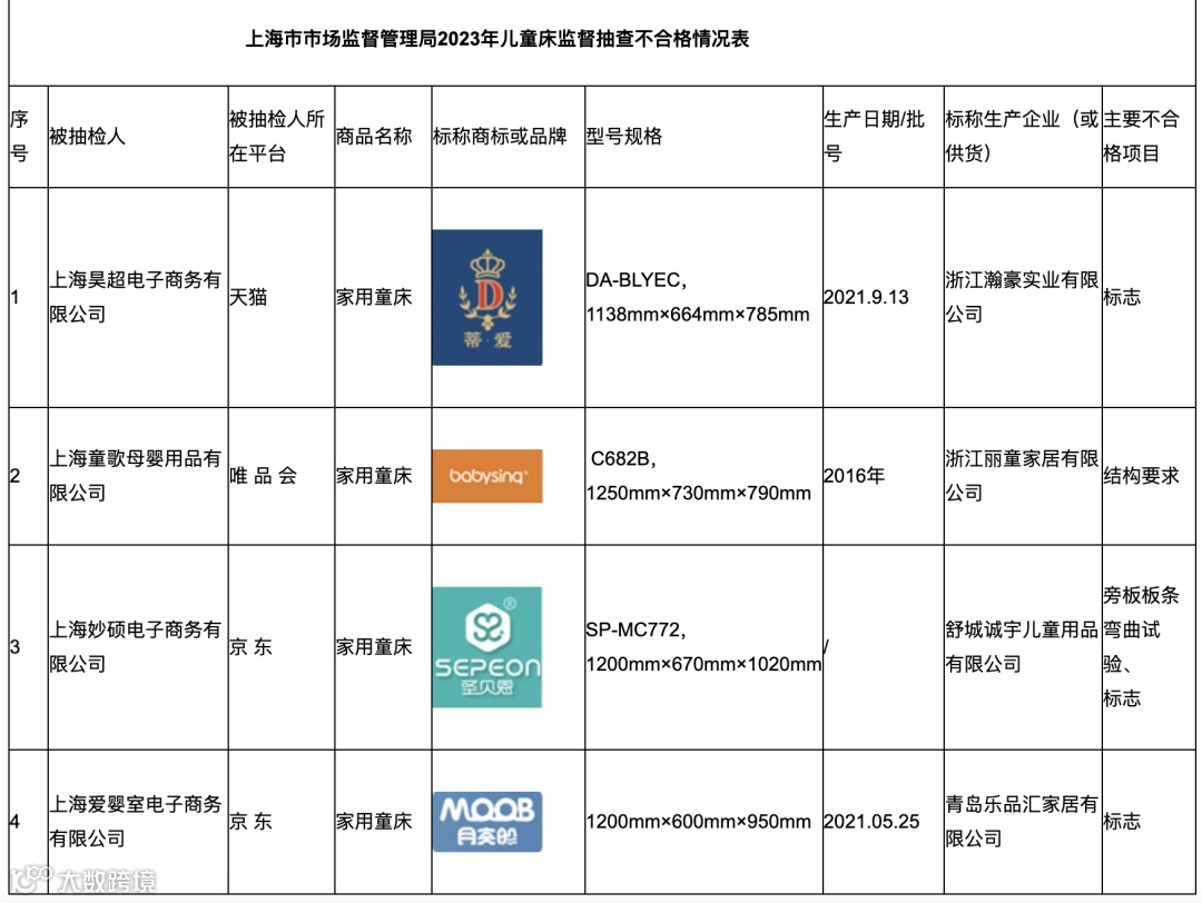 5月31日,上海市市场监管局集中组织力量对宜家、天猫、京东和唯品会4家网络平台以及静安、长宁、徐汇、普陀4个区域20家企业销售的19个品牌20批次儿童床进行了监督抽查。经检测,有4家企业4批次产品不合格,其中包括蒂爱、丽童、圣贝恩、月亮船4个品牌。本次抽查不合格项目主要是结构要求、旁板板条弯曲试验、标志3项。