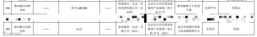 上榜原因:早在4月14日,潜水艇的一款不锈钢地漏潜水艇就被检测出“承载能力”项目不合格。而在6月5日,江苏省市场监督管理局发布的抽检报告显示,潜水艇的两款自动晾衣机又被检出“结构”项目不合格。其中,规格型号为“阳光 AB120”的潜水艇自动晾衣机,标称生产企业为柏瑞润兴(北京)科技发展有限公司(出品商)、销售单位/电商为潜水艇晓艾专卖店/天猫、样品来源为电商平台;规格型号为“A-12” 的潜水艇自动晾衣机,标称生产企业为柏瑞建材(北京)有限公司(标注)、销售单位/电商为南京市鼓楼区伟斯卫浴水暖销售中心、样品来源为实体店。
