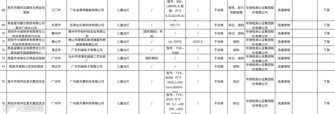 6月9日,四川省市场监督管理局发布的抽检报告显示,商标为“(图形商标)乔裕”的一款儿童台灯,被检出“标记、结构”项目不合格,其标称生产企业名称为惠州市乔裕科技实业有限公司、受检企业名称为资阳市长城物资有限责任公司自贡芙思特万达店;此外,金莱特的一款儿童台灯,被抽检出“耐热、耐火和耐起痕”项目不合格,其标称生产企业名称为广东金莱特智能有限公司。