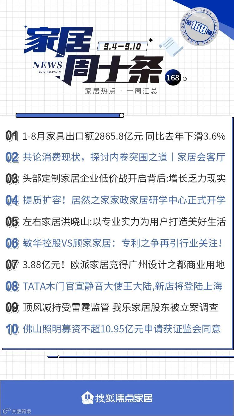 9月6日,敏华控股集团“芝华仕品牌官方”微信公众号发布《功能铁架0靠墙专利的维权声明》称,近期,敏华控股集团发现顾家家居股份有限公司推出的产品涉嫌侵犯敏华控股旗下锐迈科技股份有限公司所持有的3项专利技术的专利权,其中1项发明专利,名称为“一种支撑板及支撑组件框架” (专利号ZL202010195111.8);2项实用新型专利,一项名称为“一种活动座椅靠背随动装置” (专利号ZL201820154763.5),另一项名称为“一种沙发座框” (专利号ZL202020349371.1)。
