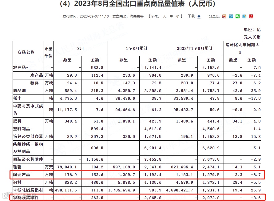 9月7日,国家海关总署公布今年前8个月中国外贸数据。家具及其零件出口额为2865.8亿元,同比去年下滑3.6%,但降幅有所收窄;陶瓷产品出口额为1193.4亿元,同比去年下滑6.7%;灯具、照明装置及其零件出口额为1941.5亿元,同比去年增长1.4%。