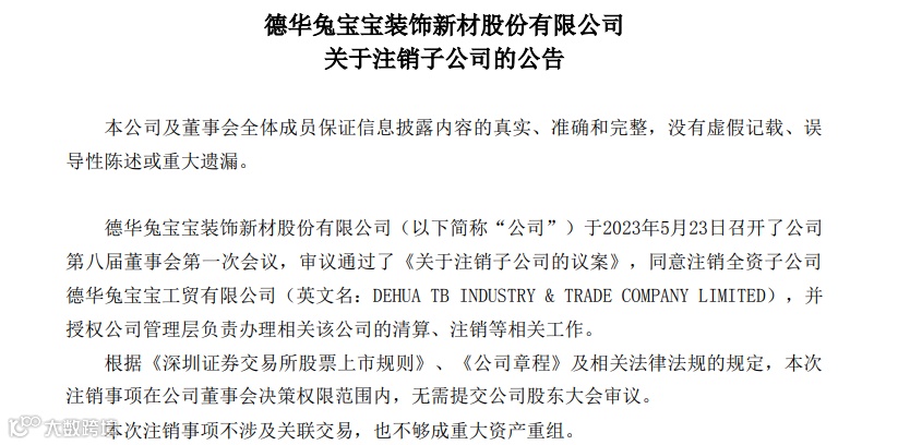 2023年5月24日,兔宝宝发布了注销子公司德华兔宝宝工贸有限公司的公告。德华兔宝宝工贸有限公司是兔宝宝的全资子公司,截至2022年底,总资产为1223.3万元、净资产1223.3万元,2022年的营业收入为0万元、净利润为-12.23万元。德华兔宝宝工贸有限公司营业范围为:科技木、地板、板材、其他木材产品及原木进出口贸易。